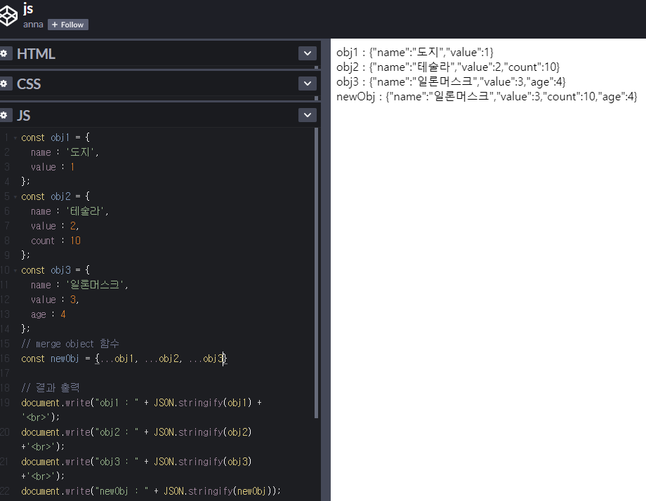 두 객체를 병합하게 됩니다.(Reference Type이 아닌, 문자열이나 숫자 등은 주소값이 아닌 실제값이 복사됩니다.)