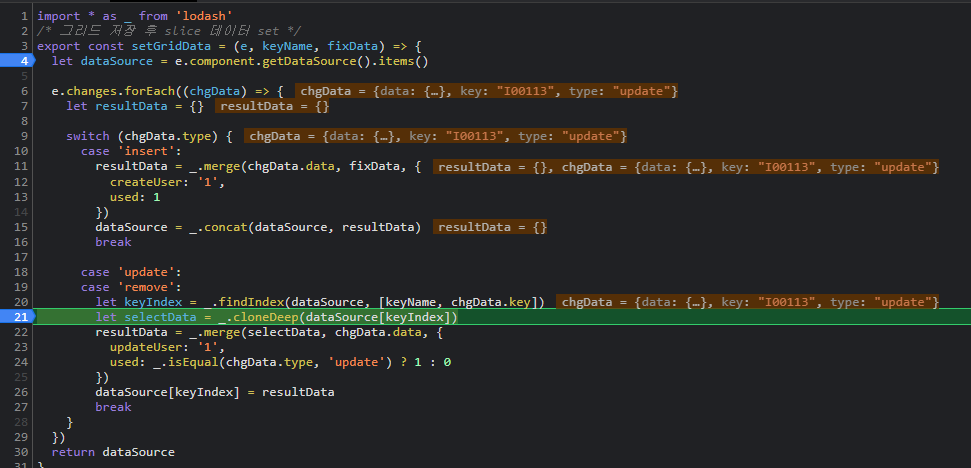 21번 라인을 보면 lodash 문법중 하나인 _.cloneDeep()를 사용하여 깊은 복사를 한뒤에 22번 라인에서 _.merge를 해주니 잘됫다.