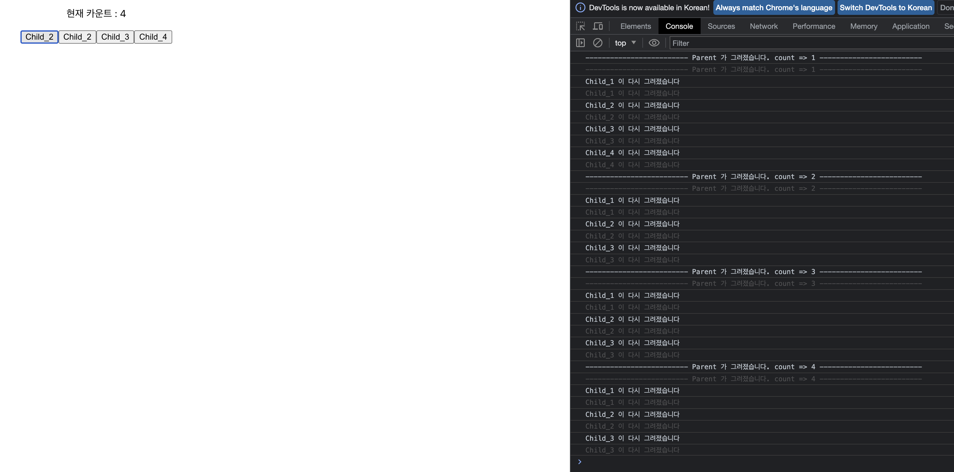 Parent의 count 값이 증가하면서 Child 컴포넌트들에 props 값이 변경되게 됩니다.