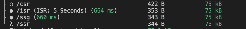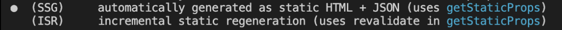 ISR 과 SSG 는 같은 표시로 표현되지만 ISR 에는 revalidate 의 값이 함께 표현되고 있습니다.