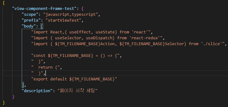 prefix : body 부분을 불러오게 되는데 우리가 snippets를 사용할때 startViewTest를 타이핑하면 저장된 body를 불러오는 명령어처럼 쓰이게 된다.