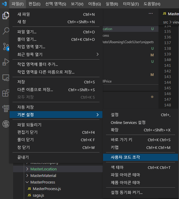 [파일(File)] - [기본 설정(Preferences)] - [사용자 코드 조각(User Snippets)] 경로로 들어간다.