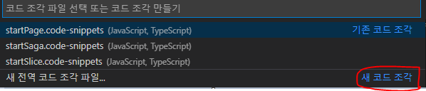 새 코드 조각을 눌러준다. 상단에 기존 코드 조각은 미리 만들어두었던 snipptes 파일들이다.