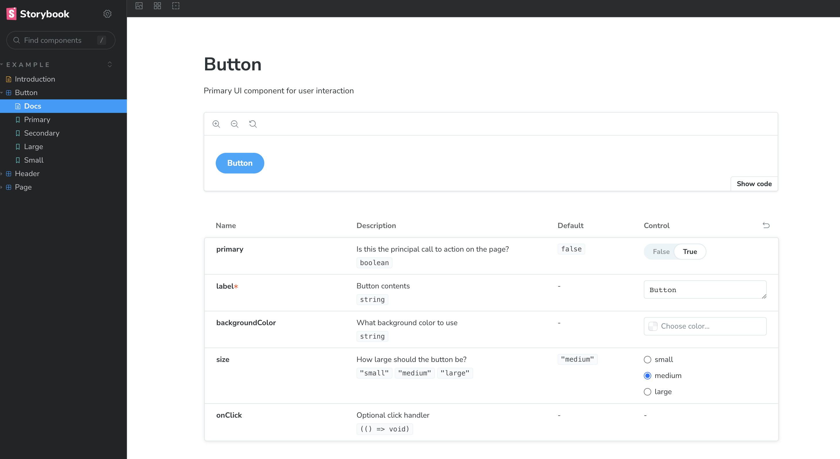스토리북을 init 하면서 생성되었던 Button 예시를 보면